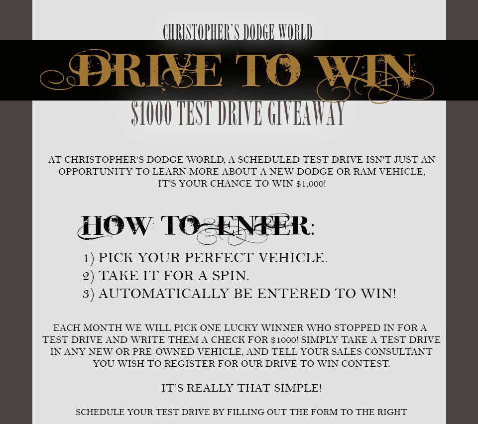 *By providing my phone number (optional) and clicking "Submit", I agree to: (1) receive calls and texts with additional information and relevant offers from Christopher Dodge RAM dealership regarding my inquiry, at the phone number above; and (2) the Christopher Dodge RAM Privacy Policy and Terms of Use. I understand that consent is not required to make a purchase and that message and data rates may apply. I also understand that I may opt out at any time. Christopher Dodge RAM takes your privacy seriously and does not rent or sell your personal information to third parties without your consent.